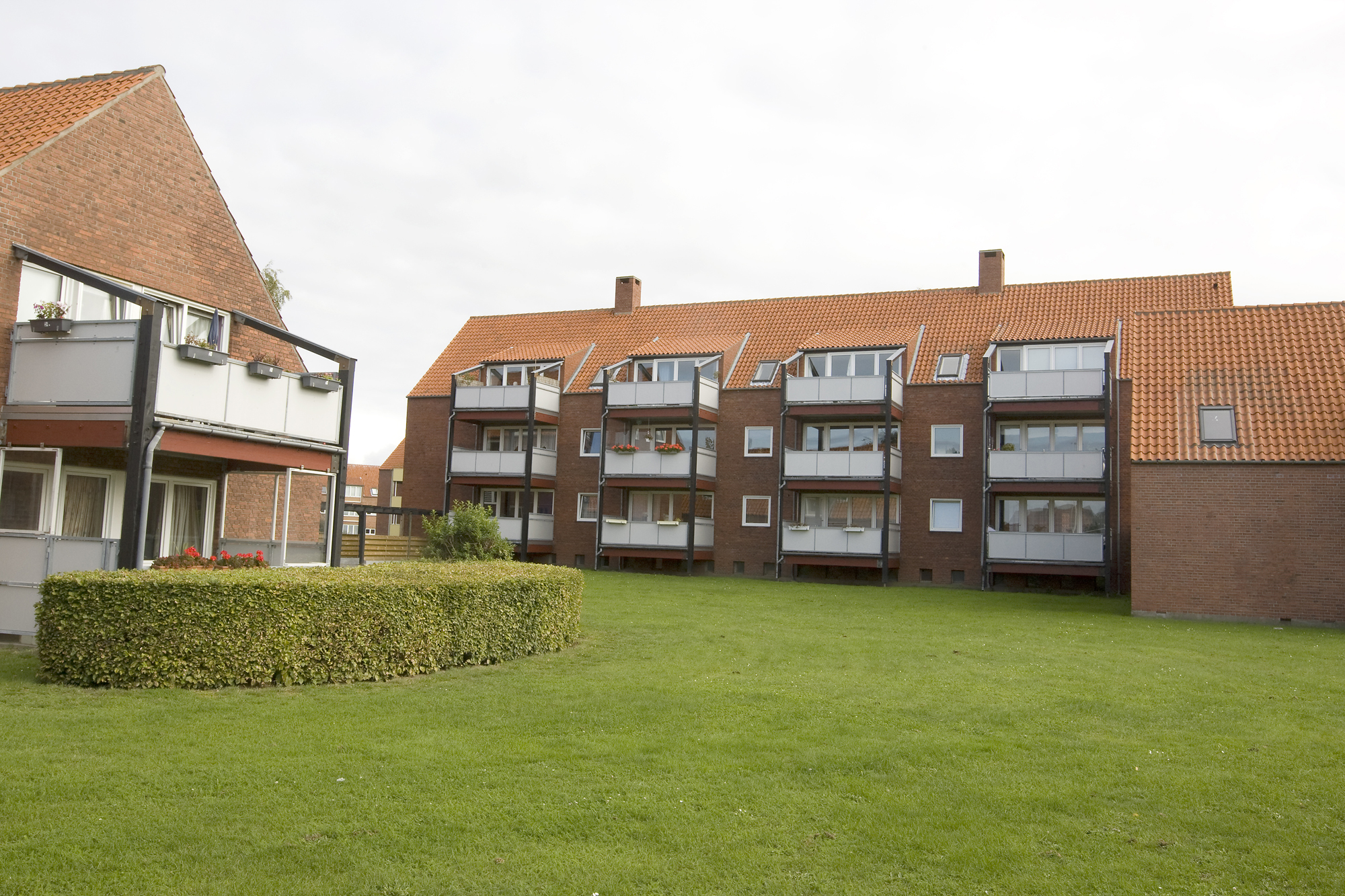 Lavt etagebyggeri med svalegang opført i 1967. Boligerne har enten altan eller egen lille terrasse.